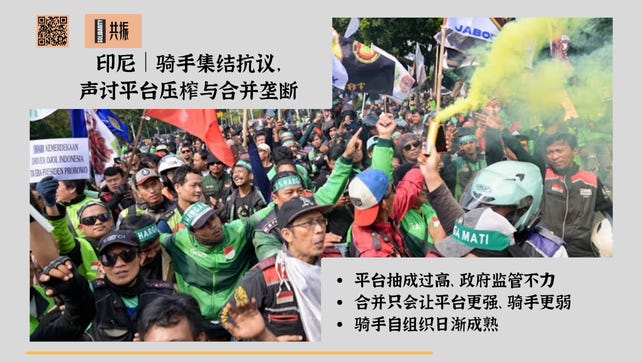 2025年5月20日,印尼多座城市爆发大规模抗议活动,包括雅加达、泗水和万隆等地,数以万计名网约摩托车与外卖骑手走上街头,举起标语、发表演讲。抗议针对印尼科技公司GoTo与总部位于新加坡的另一平台巨头Grab可能达成的合并协议。骑手们要求平台降低佣金比例,并呼吁政府介入监管。抗议者担忧,一旦合并完成,网约平台市场将面临垄断风险,骑手与司机的收入可能进一步被压缩。